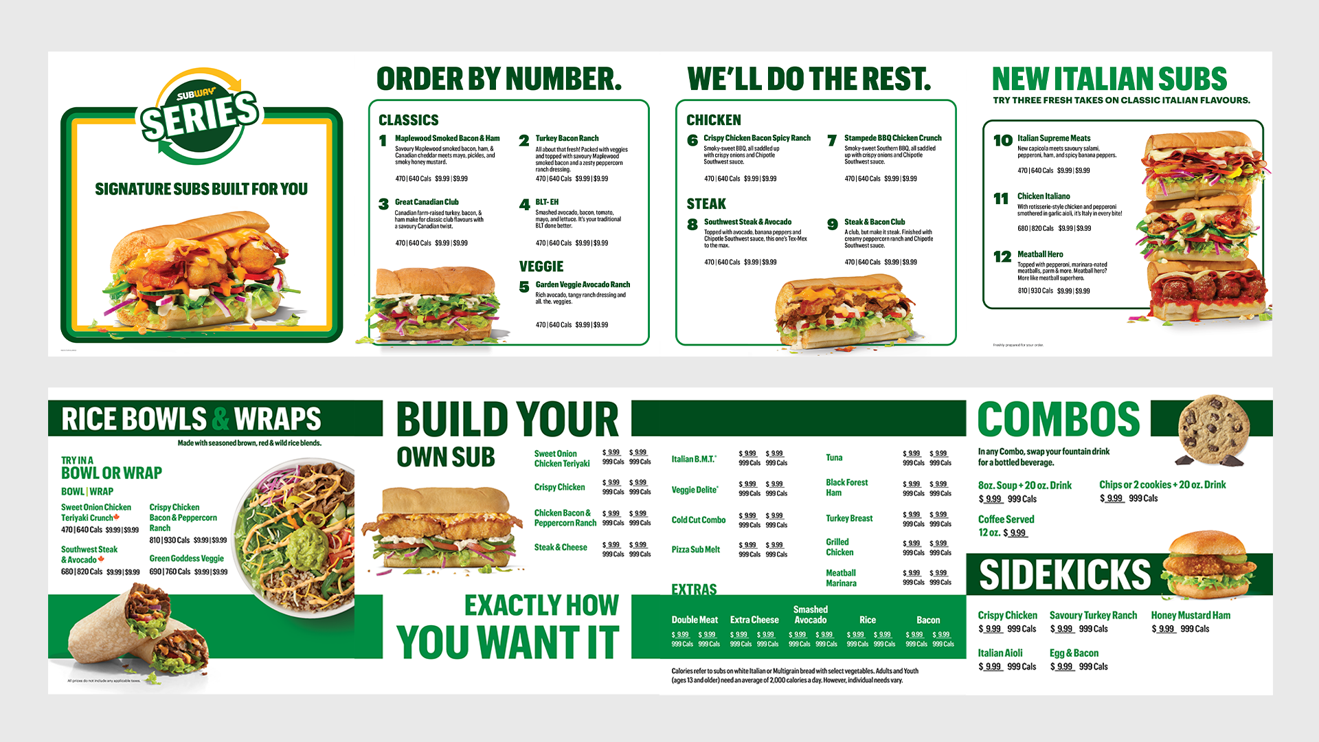 Inspired by Subway’s proud history, and the original sign from 1965, we brought in clean and softer edges to house the signature subs. Changing colours to create separation from panel to panel. To differentiate the original menu and still create an easy user journey, we used a system of two bold lines swept across the original menu making it simple to read through.
